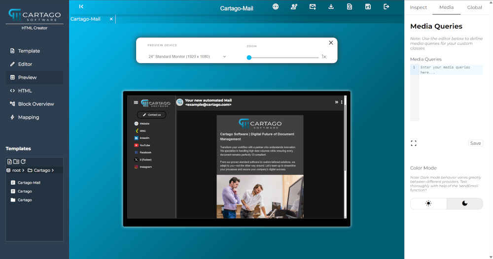 Cartago Designer can be used to create documents of all kinds, including html-documents. With its abundance of possibilities, however, Designer is sometimes oversized for relatively simple emails. That is why we are expanding our product portfolio with a lightweight tool which can be used to create html documents quickly and intuitively. In accordance with its task, the tool has been given the name HTML-Creator.